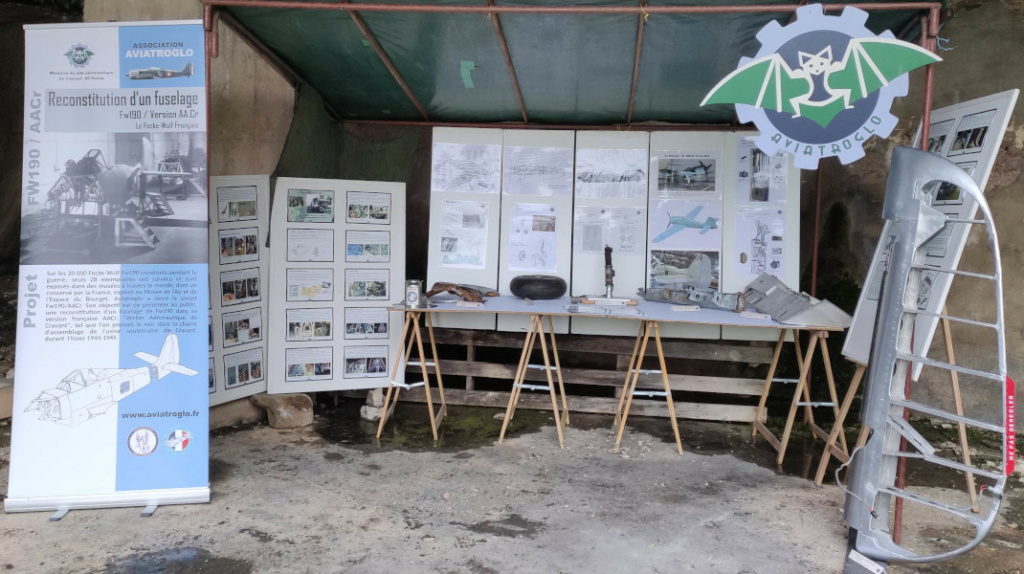 Dès l’entrée une bande audio immersive du son d’un Fw190 en vol crée une ambiance aéronautique saisissante. Avant la description des différentes étapes du projet, l’avion Fw190 est présenté d’un point de vue historique et technique et remis dans le contexte des ateliers de l’usine souterraine de Palotte. Une galerie de photos sur panneaux permet à Yves d’expliquer les méthodes de conception, de fabrication et d’assemblage du fuselage, mais aussi les contraintes techniques et les travaux de recherche documentaire effectués.