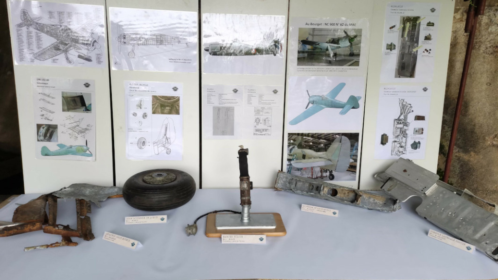 L’idée principale du projet étant d’incorporer dans le fuselage des pièces d’origine, quelques -unes sont exposées, accompagnées de leur documentation spécifiique : gouverne de direction reconstruite, roulette de queue et manche pilote récupérés auprès d’anciens employés de l’usine souterraine, aérateur moteur, élément de gouverne de profondeur, et console de cockpit provenant d’un crash.